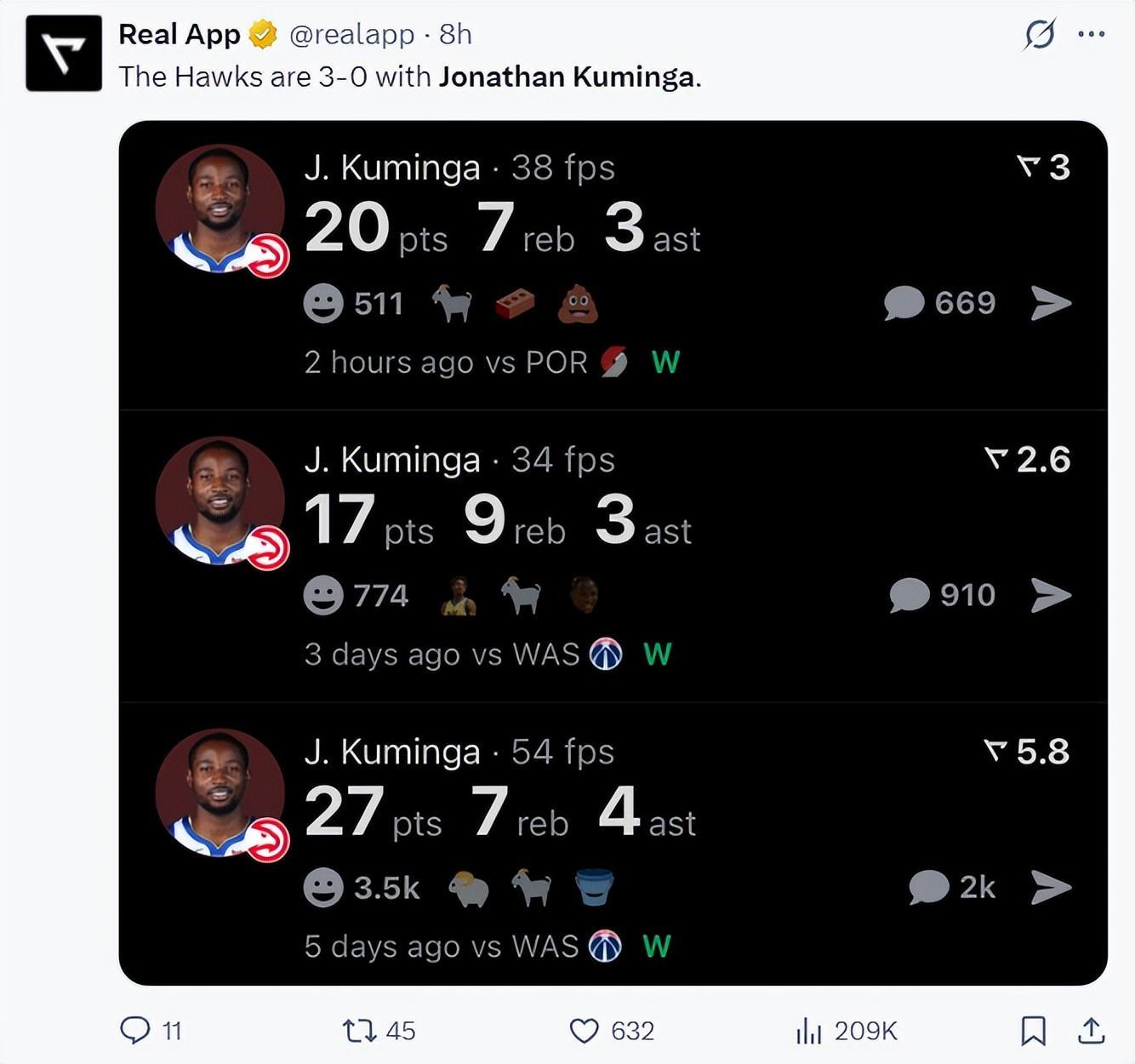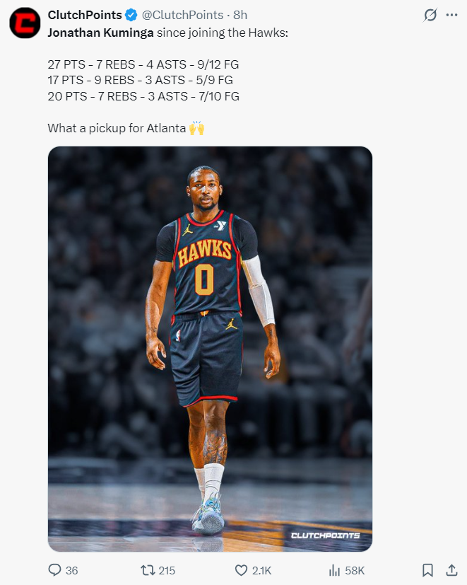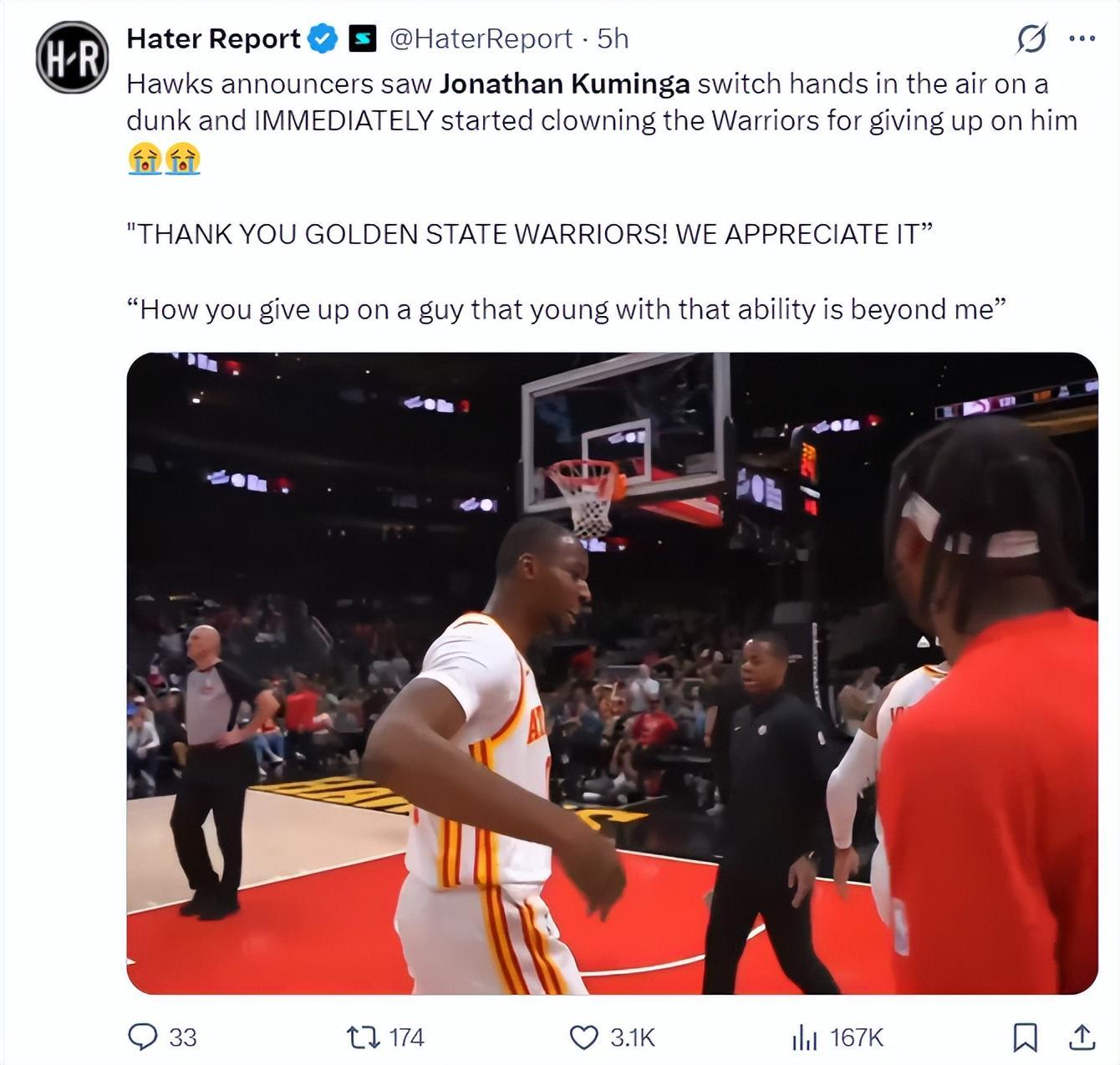 老鹰主场球迷也是杀人诛心:谢谢金州勇士队送给我们乔纳森-库明加。(此前勇士用库明加+希尔德换走了波尔津吉斯,但波尔津吉斯在勇士不温不火)